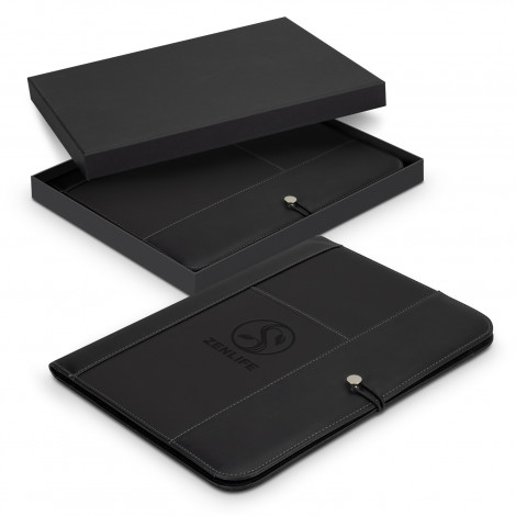 Secure thermo PU leather portfolio with a unique metal and elastic loop closure. It comes with an A4 lined pad, two slip pockets, six business card holders, three large document slip pockets, a fine mesh pocket, and a single card holder.