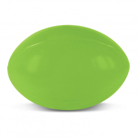 Rugby ball shaped squeezable stress reliever made from soft polyurethane.